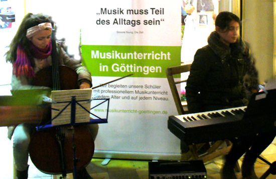 So wurde für den „Klingenden Adventskalender“ auch ein ansprechender, farbiger und informativer Flyer hergestellt. Vom 1. bis 24. Dezember gab es in Göttingen jeden Tag weihnachtliche Musik mit dem DTKV. Jeweils um 17 Uhr fand montags bis samstags vor oder in einem Geschäft in der Göttinger Innenstadt eine kleine musikalische Darbietung mit DTKV- Schülern und Lehrern statt. Täglich stand ein anderes Weihnachtslied im Mittelpunkt, zu dem auch kurze Erläuterungen und der Text zum Mitsingen vorbereitet waren. Drumherum erklangen neben weiteren Weihnachtsliedern auch andere Musikstücke, die die Schüler vorbereitet hatten. An den Sonntagen und am 24.12. beteiligten sich die Göttinger Kirchen in ihren Veranstaltungen gerne mit einem Lied.