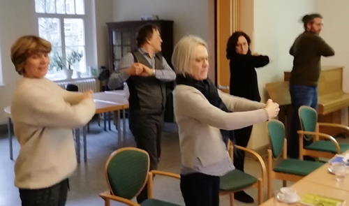 Aufgelockert wurde der Vortrag durch körperliche Übungen zur Mobilisierung und Beruhigung. Auch dies nahmen die sechzehn TeilnehmerInnen dankbar mit auf ihren Weg nach Hause und in ihre weitere Arbeit mit dem Thema.