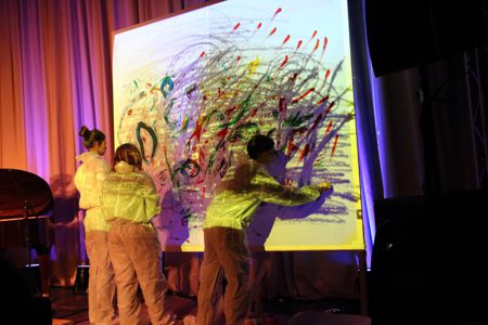 Ein besonderer Moment des Abends war der Toy-Piano-Minimal-Music-Beitrag „Ronald! Play the Toy“ dreier Schüler*innen des Gymnasiums. Präsentiert wurde das Ergebnis eines Workshops mit Radke vom 21. November, in dem zu musikalischen Ausdrucksformen im politischen Kontext geforscht und zwei Minimal-Kompositionen entwickelt worden waren. Die simultane malerische Gestaltung verwandelte den Auftritt in ein eindrucksvolles Multimedia-Erlebnis.