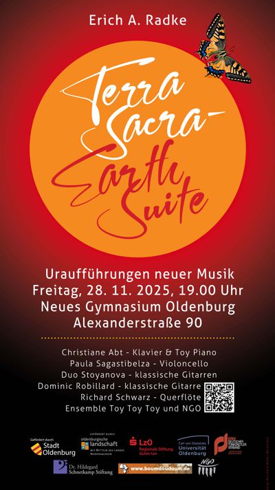 Auch der Geist braucht die richtige Ernährung – dieses Motto prägte den außergewöhnlichen Konzertabend am 28. November um 19 Uhr in der Aula des Neues Gymnasium Oldenburg. Sechs Uraufführungen von Erich A. Radke wurden von sechs international bekannten Musiker*innen sowie sieben Schüler*innen des Gymnasiums interpretiert. Dem Publikum bot sich ein eindrucksvoll vielschichtiger Abend zeitgenössischer Musik: verständlich, eingängig, anspruchsvoll und berührend – ohne jede Banalisierung.